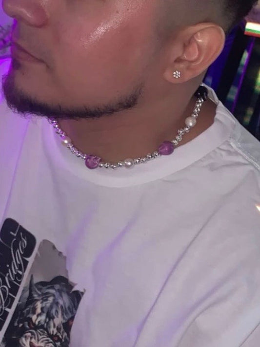 Glass Evil Eye, Metal Skull & Freshwater Pearls Necklace